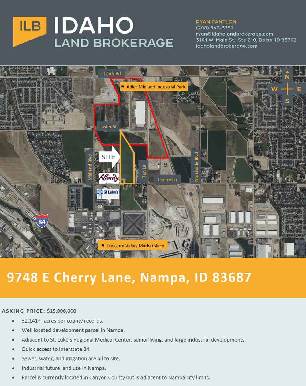 Well located development parcel in Nampa Adjacent to St. Luke’s Regional Medical Center & large industrial developments Quick access to Interstate 84. Industrial future land use.