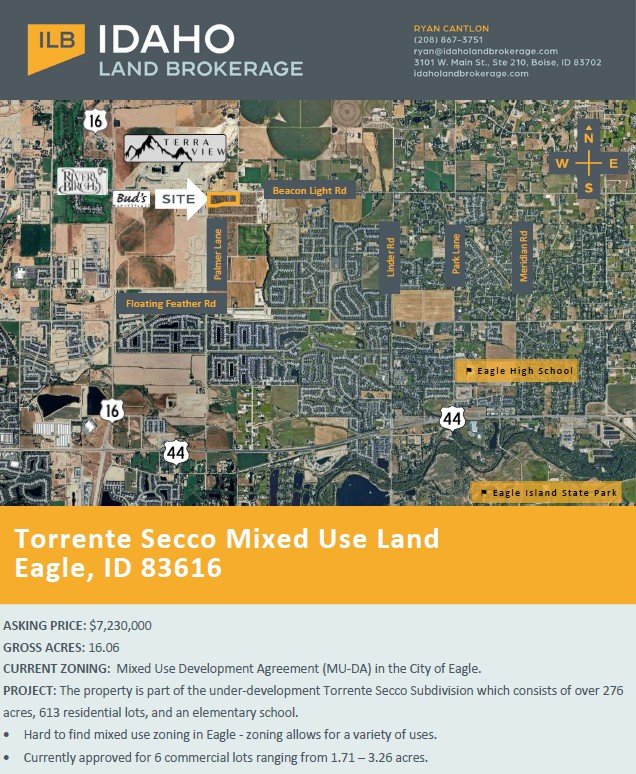16.06 acres of mixed use zoned land available in Eagle, ID. The property is part of the Torrente Secco Subdivision and currently has preliminary plat approval for 6 commercial lots ranging from 1.71 - 3.26 acres.
